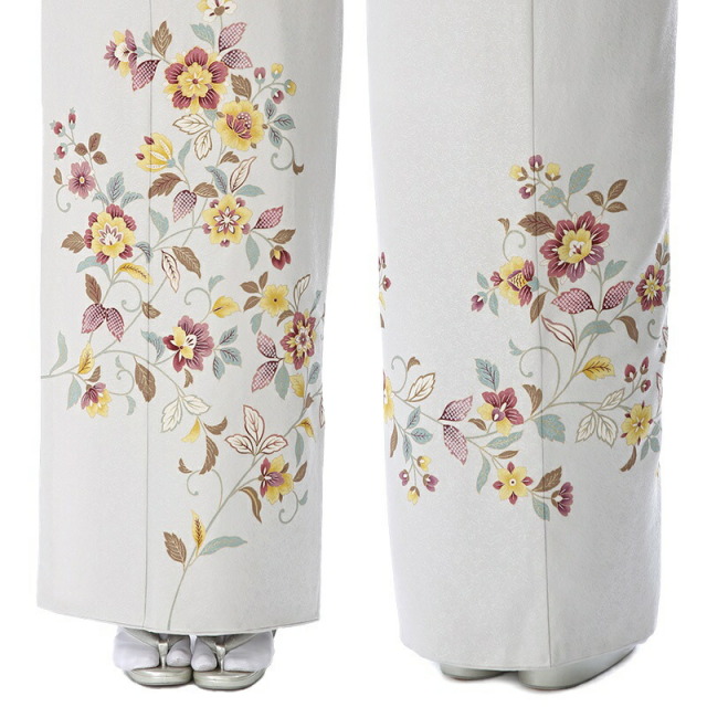上品さとお洒落さのバランスがいい訪問着です。地色の落ち着きのあるカラーは「白鼠(しろねずみ)」と呼ばれます。銀の色のように上品な明るいグレーです。描かれる文様は「唐花紋」。中国から伝わる文様で、唐風の花や蓮花、牡丹、空想の花など数種類の植物のモチーフを合成することにより出来上がったもの。特定の花を指すのではなく、牡丹のような形の唐風の花などを、唐花とよんでいます。四季を問わずに着用していただける人気の文様になります。シックな着物に、彩度が高いビビットな色味で描くことで、文様がはえて、古典すぎずにお洒落で粋な印象に。すっきりとまとまりがあり、スタイリッシュに仕上がっています。他とは被らない自分らしいスタイルを好まれる方におすすめの一着です。