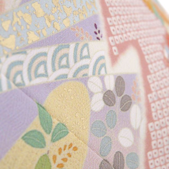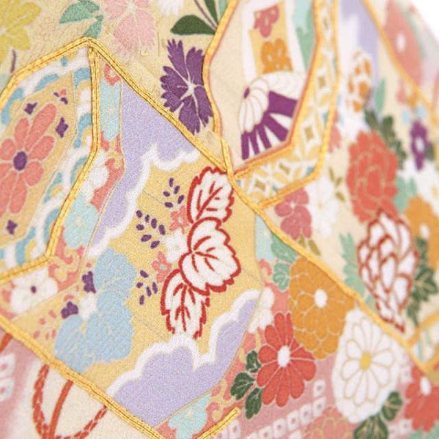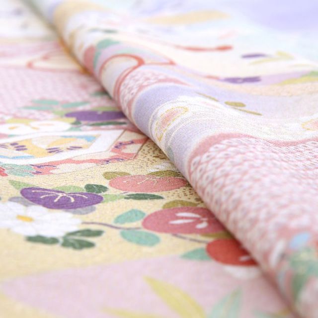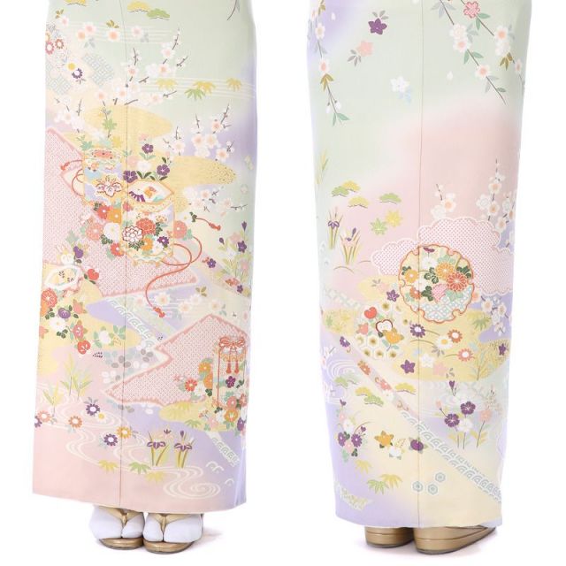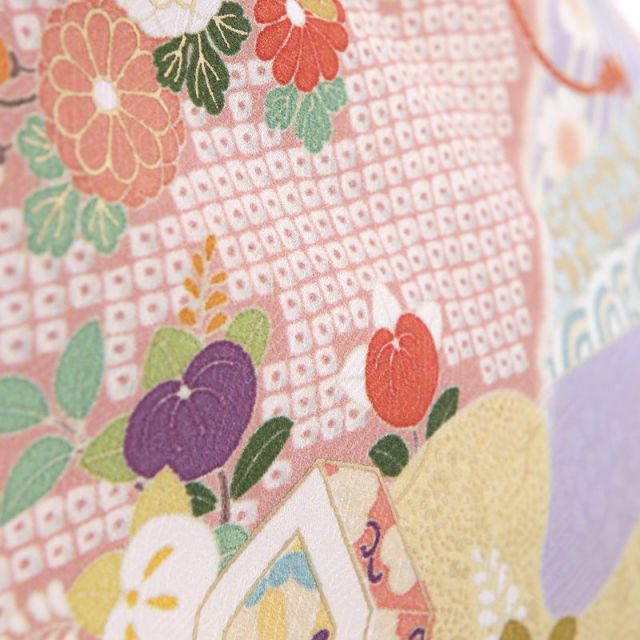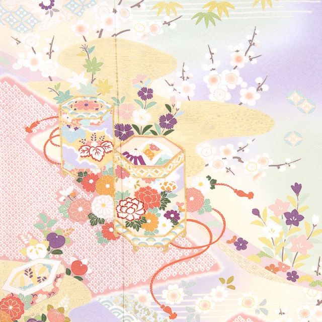 きもの全体を多彩なペールカラーで染め上げた訪問着です。淡く柔らかな色と色との染め分けの美しさがこちらの装いの魅力。はんなりとした色彩に描かれるのは、絢爛な花々や縁起のいい吉祥文様です。「貝桶(かいおけ)」は、平安時代などで宮中の遊びで貝合わせというものがあり、その貝を入れておく容器が文様化されたものです。貝とは他の貝とは合わない二枚貝の特徴を持つことから男女の永遠の契りを象徴するものとされており、婚礼のシーンにぴったりです。「雪輪(ゆきわ)」は、雪の結晶を花に見立てた吉祥文様。豊作や子孫繁栄を願って使われます。雪輪の中にはが花々が描かれていて、華やかで格調の高い文様です。「菊」は、太陽のように咲く姿から最も位の高い花とされ、高貴さをあらわしています。「松竹梅」は、逆境に負けない力強さ、生命力を表しています。古くから伝わる伝統的な文様と、豊かな色彩が、身にまとう人、見ている人、両方の心を彩ります。
