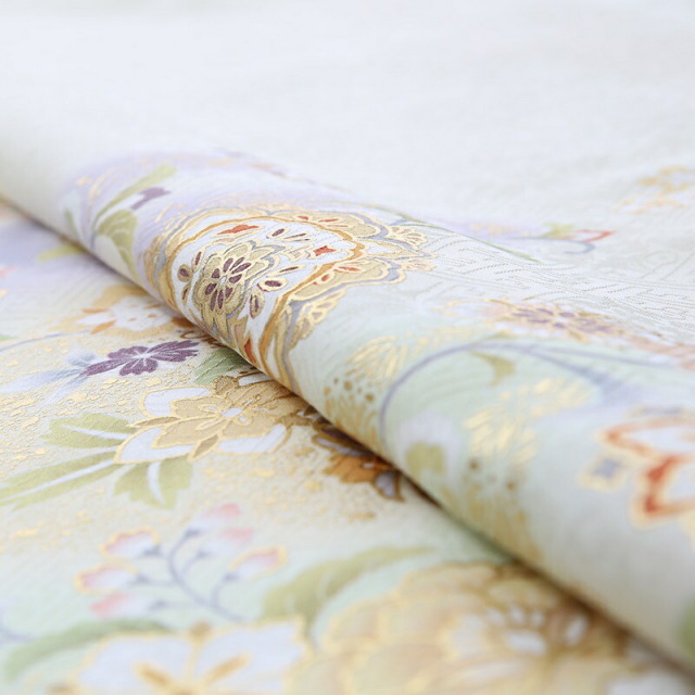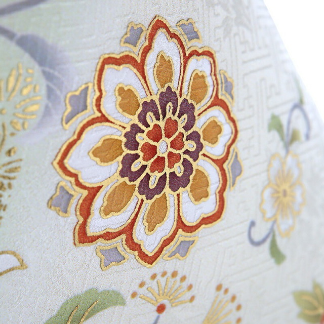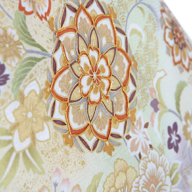 エキゾチックな雰囲気漂うこちらの訪問着。着物の地色は「淡黄蘗(うすきはだ)」と呼ばれる明るく淡い黄色。明るいのに儚げな雰囲気のある色味は、まるで暗い水平線から顔を出したばかりの月の色のような上品なカラーです。そして大きく描かれるのは、豪華な「宝相華(ほうそうげ)」。宝相華は、想像上の花の文様です。正倉院文様と呼ばれる、奈良時代に東大寺の正倉院に収蔵された、染織品に表されもの。インドや中国から伝わったもので、格調の高さを感じます。また「唐花紋(からはなもん)」も中国から伝わる文様で、唐風の花や蓮花、牡丹、空想の花など数種類の植物のモチーフを合成することにより出来上がったもの。特定の花を指すのではなく、牡丹のような形の唐風の花などを、唐花とよんでいます。どちらも四季を問わずに着用していただける人気の文様になります。伝統的なきものにモダンさが足され、お洒落に仕上がっています。格調の高さを感じる非常に豪華な装いは、おめでたいシーンにぴったりでしょう。