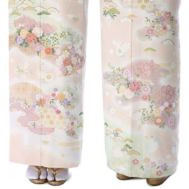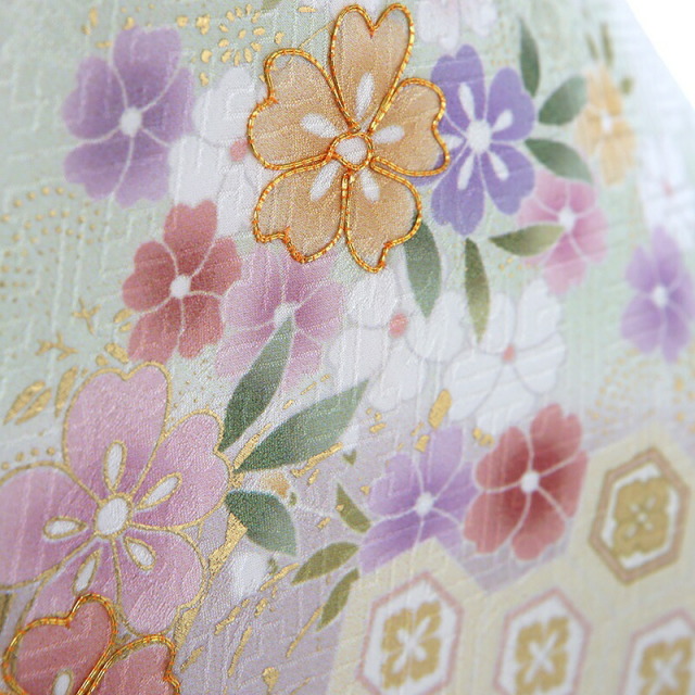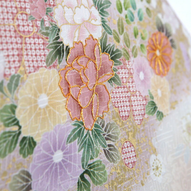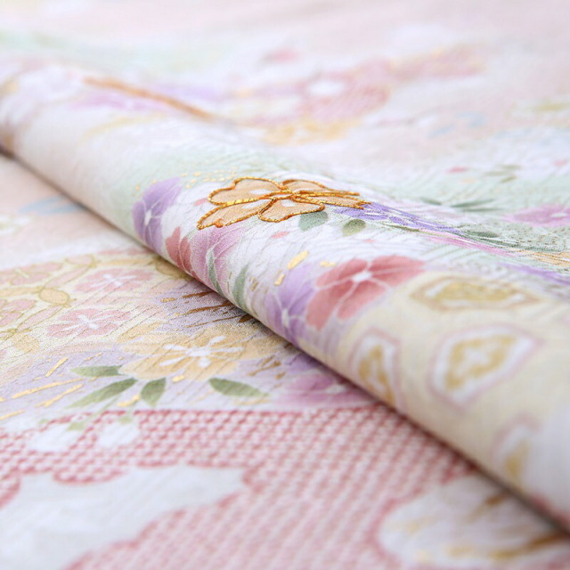 柔らかいふんわりとした色使いが可愛らしい訪問着です。着物の地色は、桜の花びらをイメージさせる「桜色」。ほんのり色づいた淡いピンクは透明感があり、清楚な印象を与えてくれます。描かれる文様は縁起のいい吉祥文様ばかり。「菊」は、花の形から太陽を連想させ、最も位の高い花とされ皇室の家紋としても使われています。「牡丹(ぼたん)」はたくさんの花弁があり「百花の王」と呼ばれており、富貴、高貴、幸福を表しています。「松」は、一年中美しい緑を絶やさないことから、逆境に負けない力強さ、生命力を表しています。「亀甲花菱(きっこうはなびし)」は、亀をモチーフにした六角形の中に花菱が描かれていて、亀は長寿を表しています。可愛さと上品さが非常にいいバランスで仕上がっているこちらのデザイン。色彩や文様の意味を知り、お祝いの想いを着物に託せるのは、日本の伝統文化ならではの楽しみ方でしょう。