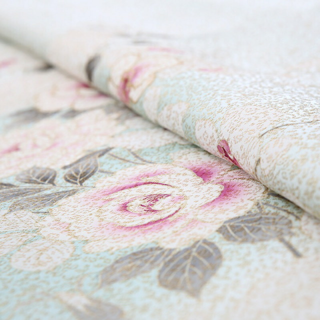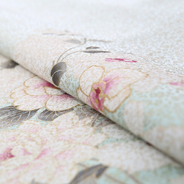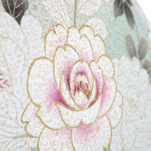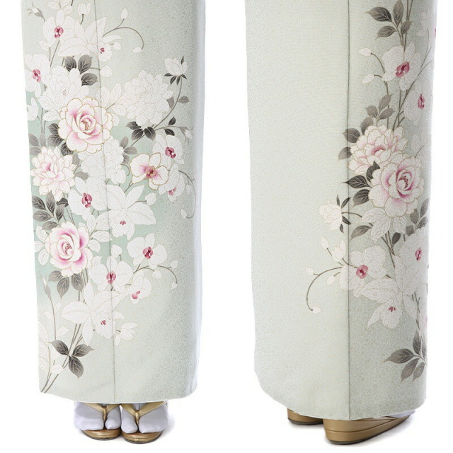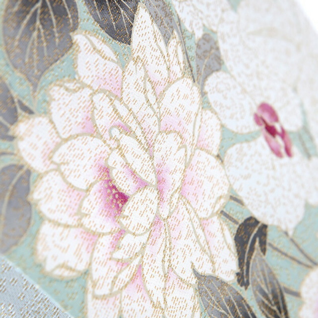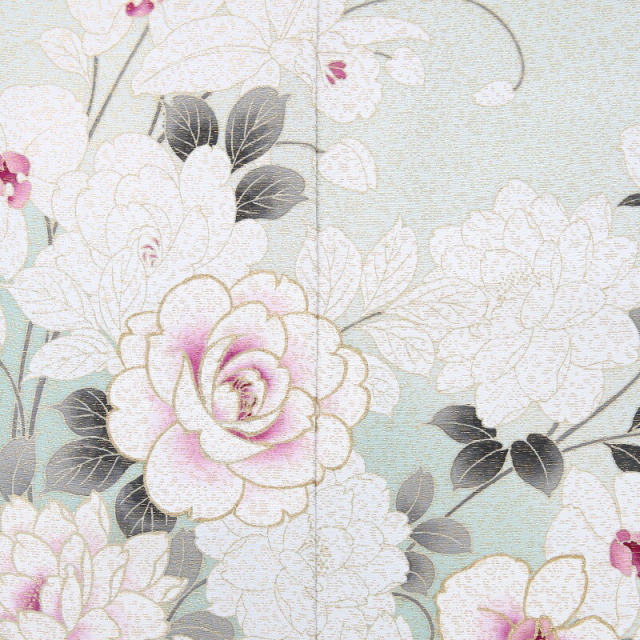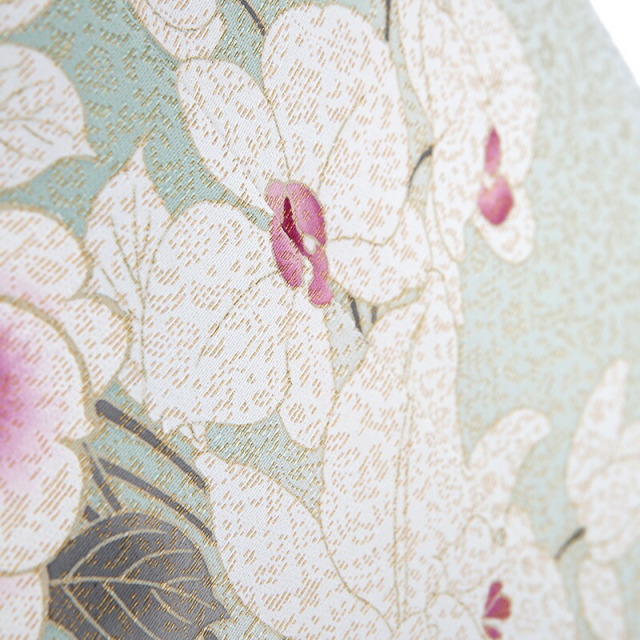透き通るようなペールグリーンの地色に、エレガントな雰囲気漂う豪華な花々の文様を合わせた訪問着です。ペールグリーンは「白緑(びゃくろく)」と呼ばれる伝統色。鉱物の「孔雀石(くじゃくいし)」から作られる岩絵具のカラーで、淡く優しい雰囲気を感じます。そして、描かれる「牡丹(ぼたん)」は、たくさんの花弁があることから「百花の王」と呼ばれており、富貴、高貴、幸福を表しています。「蘭(らん)」は中国から伝わった花で、「善人は蘭の如し、王者の香りあり」と尊ばれ、花々の咲き誇る春に咲き、上品で気高いその姿は貴人の風格に例えられてきました。透明感があり上品なこちらの装いは、祝福の華をそっと添えてくれます。モダンな雰囲気もお洒落な特別な一着です。