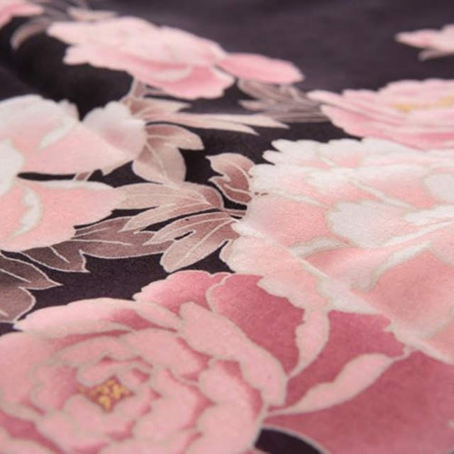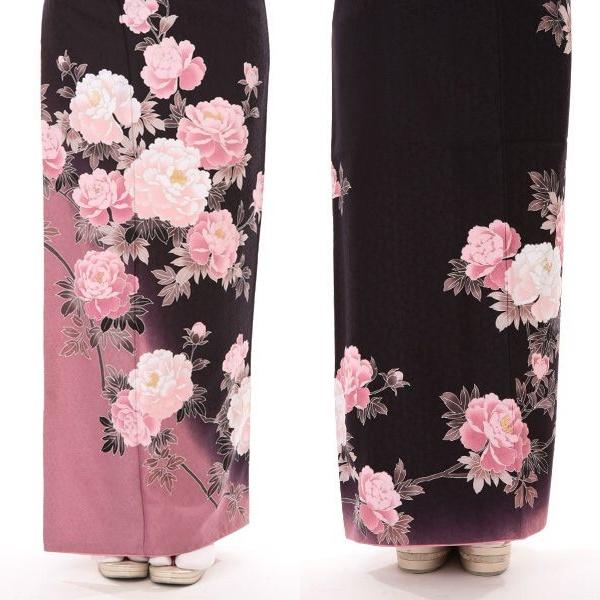 黒地の着物に薄紫の色模様が美しい訪問着、ピンクに咲いた牡丹も華麗に描かれひときわ豪華な装いをときめかしてくれます。牡丹は古くより多様な呼び名を持っています。「富貴草」「百花王」「花神」「花王」などどれも花の姿に相応しい呼び名です。細く真っすぐな茎の先に小さな丸いつぼみから大輪の花を咲かせる姿は「美しき女性の座る姿」にもよく例えられていますね。もともと牡丹は中国原産で新年のお祝い事には欠かせない植物だったようです。牡丹の花言葉は広くは「王者の風格」や「富貴(ふき)」「恥じらい」などがあります。シルクを思わせるような花びらが幾重にも重なり、ふんわりと丸まった姿が王者の風格に相応しいとも言われています。牡丹の牡の字は「オス」と言う意味を持っており、雄しべや雌しべが花びらに変化し種が出来ていくことから「牡」として形容されたと言われています。また牡丹の「丹」の字は「赤色」を意味しています。牡丹のピンクや赤の色からも理解できますね。世界中の人々を魅了する牡丹の花は素敵な女性の装いを豪華にそして潤色を添えてくれることでしょう。