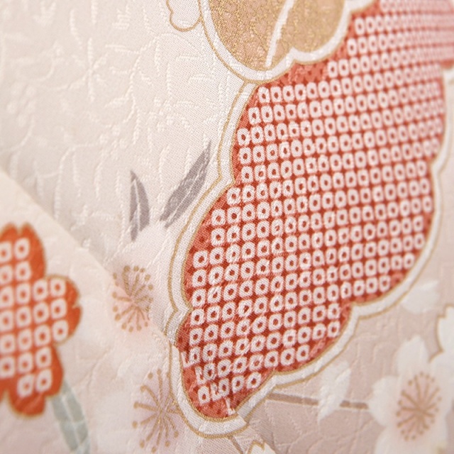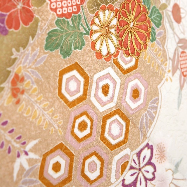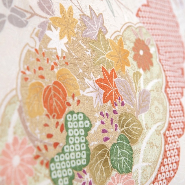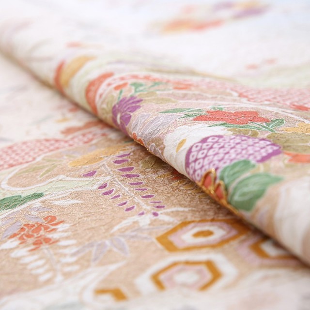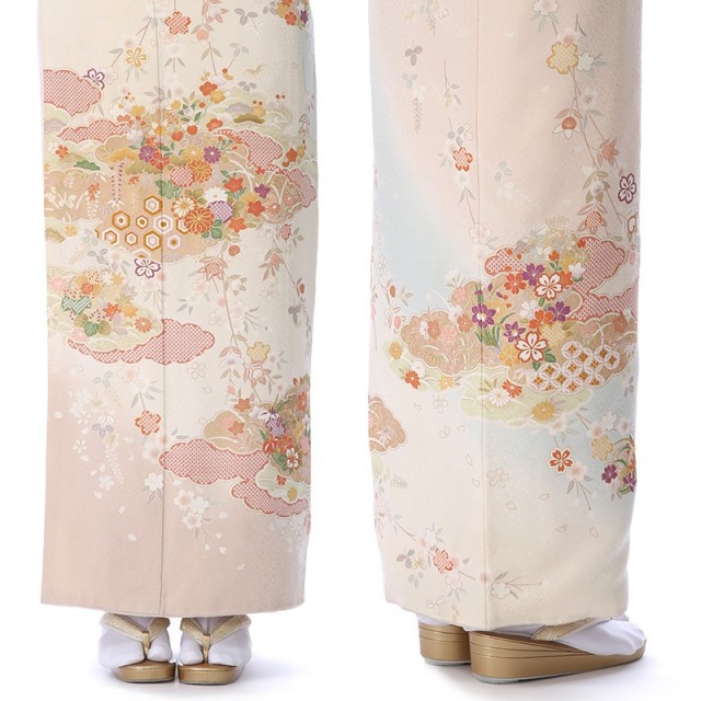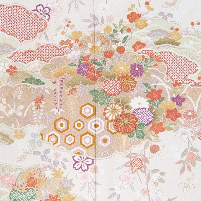 このお着物を一言で言い表すならば、「着物らしい着物」。パッと見て、お祝いのお着物なんだなと分かる、安心感がたっぷりです。優しいお色目はお顔映りもよく、場の雰囲気も明るくしてムードを高めてくれます。日本は、一年間を通して様々なお花を楽しむことができる国です。このお着物にも、季節を限ることなく、四季の花が描かれています。成功を意味する「花ひらく」という言葉もあるように、花は生命の誕生や成就する喜びに溢れる、とても明るく前向きな文様です。桜に梅に菊や橘など、お着物柄として好んで用いられるおめでたい花がたくさん。一見にぎやかな様子にも見えますが、調和する色合いのおかげで品良く仕上がっています。もくもくっとした形は、見たまま「雲」を表し、輪郭の中に色々な模様を描いたものを「雲取り」と言います。内に収まるって、とても心地よい感じがしますし、物事を大切に守るようなイメージもあります。実は、神様や龍の住処とも考えられています。雲の上の存在という言葉にもあるように、人間界との境界線のような役割もあるのかもしれませんね。お願い事を届け叶えてくれそうな、縁起の良さと品の良さをダブルで味わえる訪問着です。
