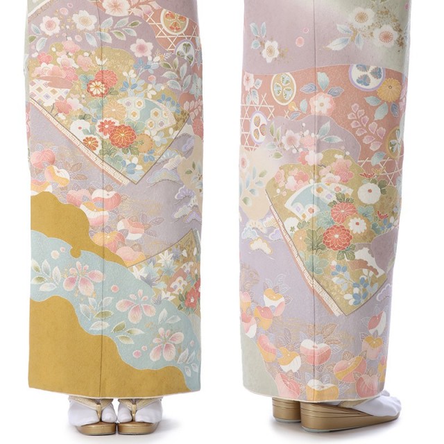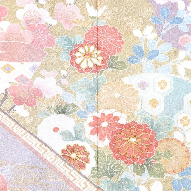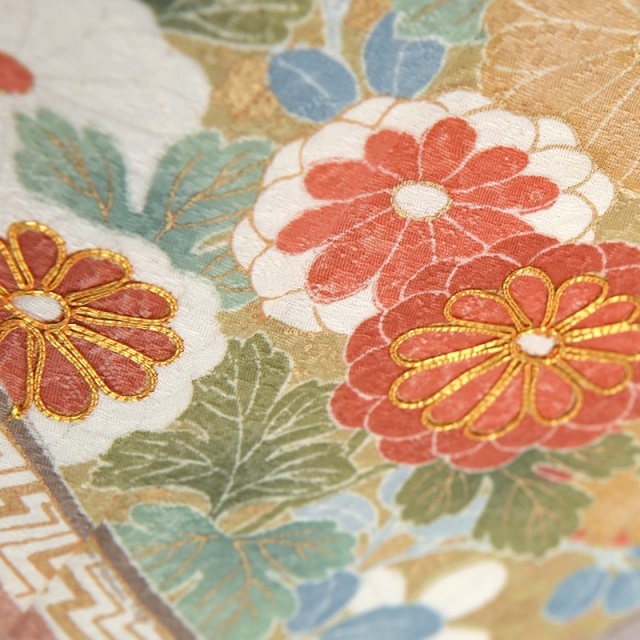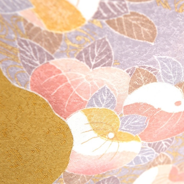 カラシ色の地色は、アンティークな雰囲気がありつつも、どこかモダン。そんなおしゃれな一着です。しっとりとした美しさで、大人の女性を華やかに包みます。お着物にはさまざまな文様が色鮮やかに描かれ、見る者を引き付けます。金の刺繍がほどこされた菊の花は美しく香しい花。天皇家の家紋としても使用されており、格調高い文様として扱われ、長寿延命を意味する吉祥文様です。裾付近に描かれている“橘文”は、ハートの形の葉が色とりどりに描かれてる様子が可愛らしい印象です。橘は日本においては「常世の国の果樹」とされ、吉祥の意味を強く持ちます。絵柄は多くにぎやかですが、一つ一つが落ち着いた色味で描かれているので、上品さがあります。シックで美しい一着は大人の女性にふさわしく、おめでたい場に華を添えることでしょう。