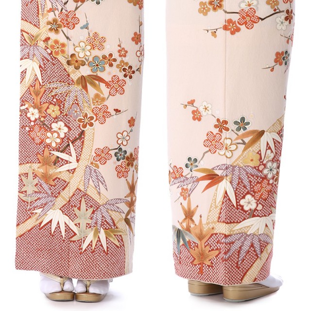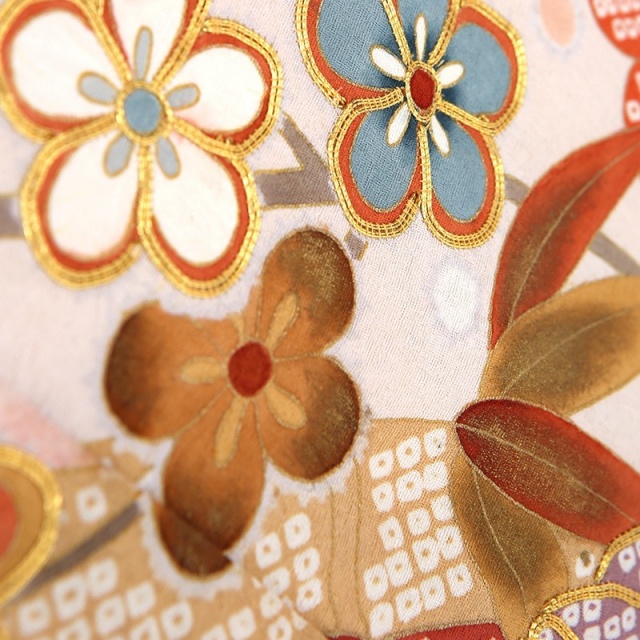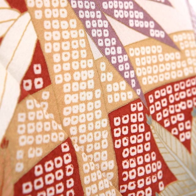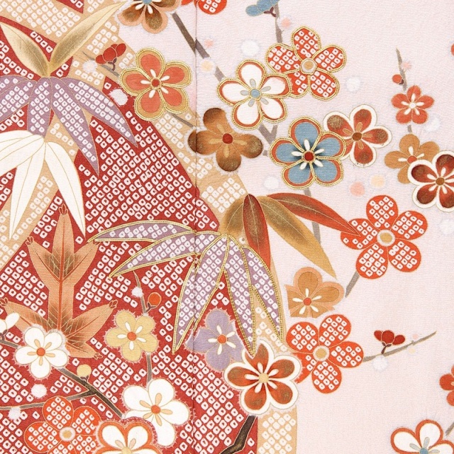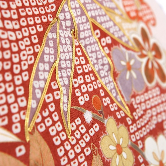 落ち着いた朱色と鹿の子絞りがアンティークな雰囲気をかもし出す、上品で華やかな一着。梅と笹の絵柄が大胆に配置され、和の美しさを感じます。植物を描いた文様の中でも“梅”は古来、日本人に最も親しまれてきたと言っても過言ではありません。着物に留まらず、様々な物に描かれる文様として非常にポピュラーです。梅はその愛らしい花の姿や、独特の枝ぶり、まだ寒い初旬から芳しく咲く様子が、万葉集の中にも数多く歌われています。大小さまざま、鮮やかな色で描かれた梅。梅は松竹と合わせて描かれることも多い吉祥の文様です。笹は、多くの着物では脇役のように扱われがちですが、こちらのお着物ではその涼やかな美しさを存分に放っています。笹は冬も緑を保ち、群生することから「清らかで秩序が保たれている」ことを表します。丸みをおびた可愛らしい梅と、直線的な笹がバランスよく、他にはない美しさがとても魅力的な一着です。