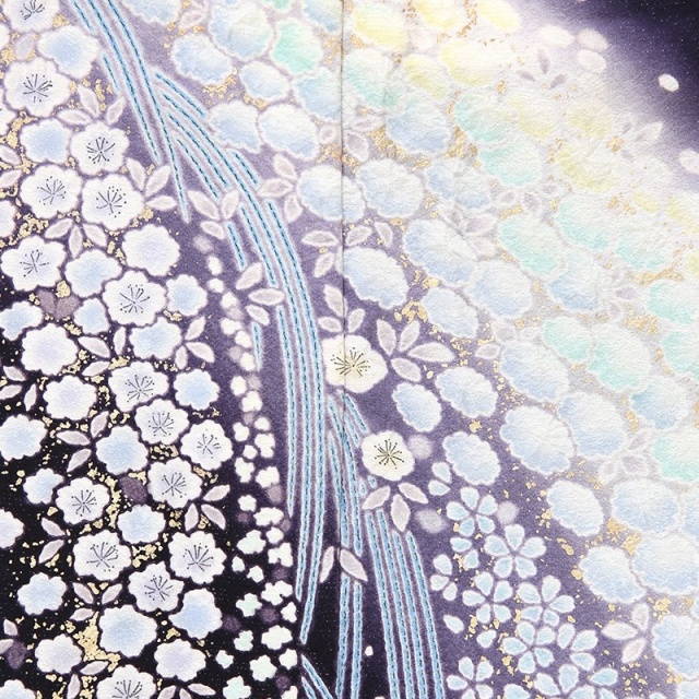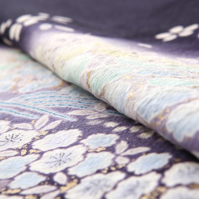 クールで大人っぽい落ち着いた地色に、桜が流れるように描かれた、美しく上品な一着。それはまるで夜空にうかぶ天の川のようにも、穏やかな川の流れのようにも見えます。小さな桜がひとつひとつ集まって構成される流れは、見る者をうっとりさせるような、そんな妖艶な美しさを放ちます。桜は、日本を代表する花。平安時代から日本人に親しまれてきた文様です。春になるといっせいに咲き誇ることから「繁栄」や「豊かさ」を意味します。細かく繊細に描かれた桜は、大人の女性の美しさを引き出し、いっそう魅力的にみせてくれることでしょう。シックで気品あるお着物ですから、大人の女性にふさわしい一着と言えるでしょう。桜が奏でる美に酔いしれてみませんか?