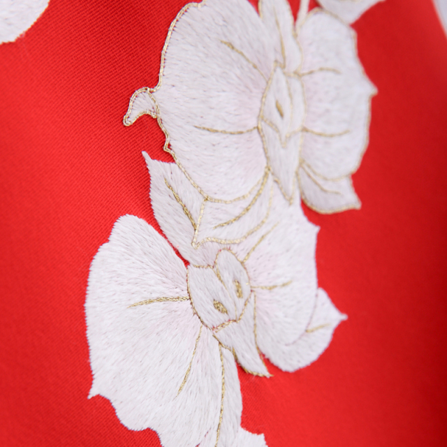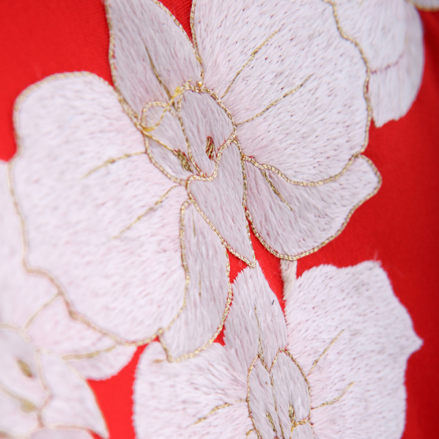 京都にある「尾峨佐染繍」。総刺繍で作られた最高級の産着です。尾峨佐染繍は手刺繍にこだわって作り続けてきた刺繍メーカーです。丁寧に一針一針縫われていく作品は、他とは比べられないくらいの糸の光沢感や立体感が出ます。また柔らかい風合いも手刺繍でしか表現できないポイントです。上品な赤の着物地に描かれるのは白刺繍の「胡蝶蘭」。花びらが、蝶が舞っているように見えるので、幸せが舞い込んでくるという意味が込められています。ふっくらと浮かびあがるように刺繍が施されている芸術品で、大変豪華で華やぎ溢れるお着物です。素晴らしい職人技が作品から伝わってきて、見るものすべてを魅了するくらいの最高級品です。なかなか目にすることのできない特別な着物ですが、人生でたった一度の特別な日に着用すれば一生の想い出になるのは間違いないでしょう。