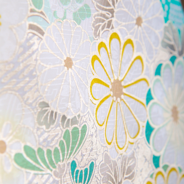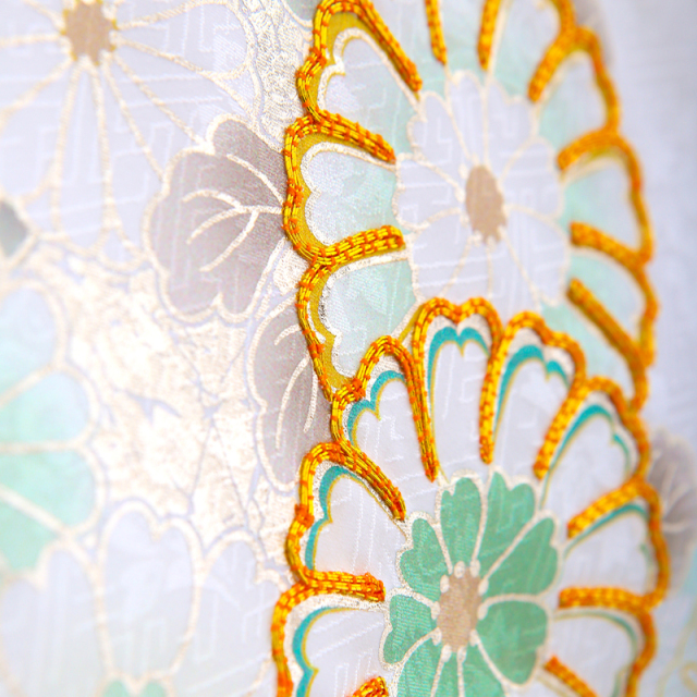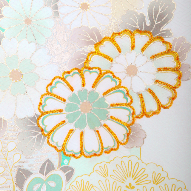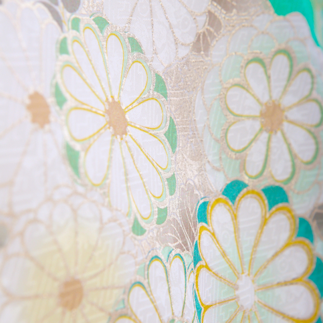 やさしく澄んだミントグリーンの地色に、菊や桜、橘、松竹といったおめでたい文様が穏やかに広がる一着です。白を基調とした花々に、金彩や繊細な刺繍が重なり合い、控えめでありながらも上品な華やぎを感じさせます。菊は長寿や無病息災、桜は新たな門出、橘は子孫繁栄、松竹は変わらぬ強さを象徴し、これからの人生への願いがやさしく込められています。淡くやわらかな色合いは赤ちゃんの愛らしさをより引き立て、お宮参りの穏やかな時間に自然と馴染みます。ご家族で迎える大切な一日を、静かで気品ある美しさで包み込んでくれる、桂由美ならではの上質な正絹の産着です。