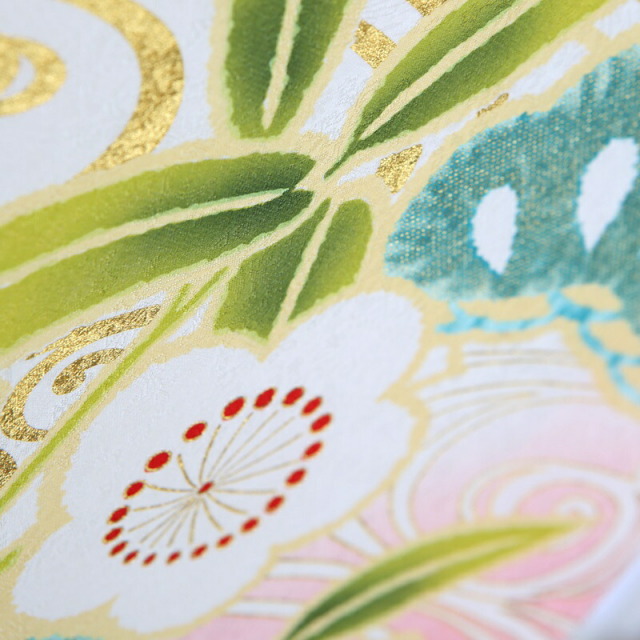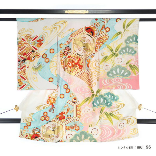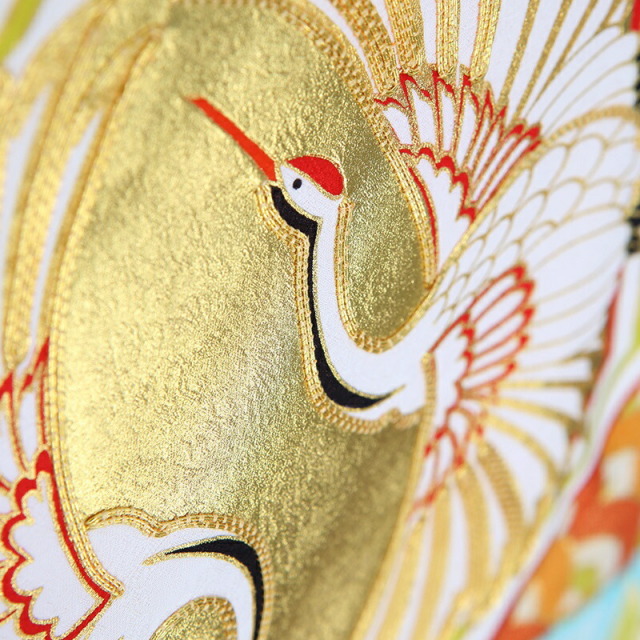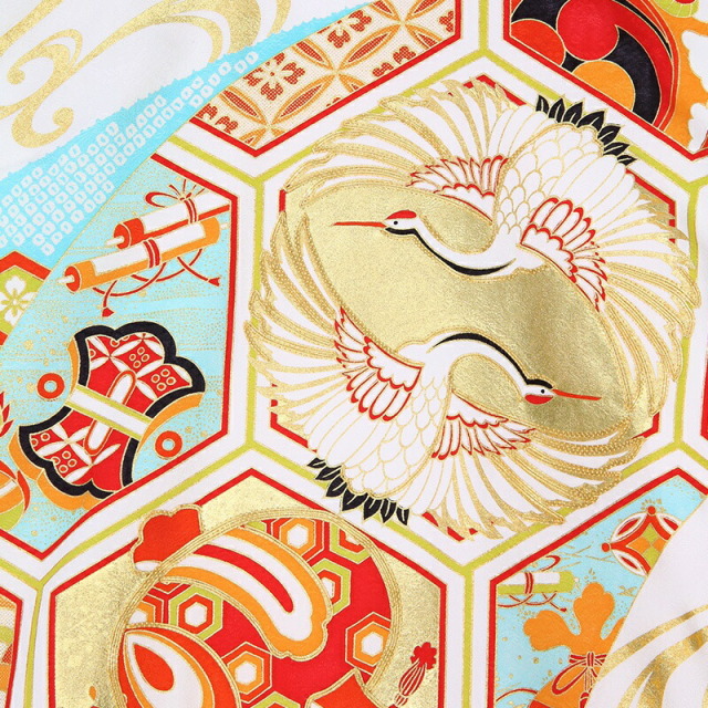 清らかな白地に、鶴や松、亀甲文様などの吉祥柄が美しく配された一着です。金彩の輝きとともに、淡い水色ややさしいピンクが重なり合い、晴れの日にふさわしい華やぎと上品さを演出します。長寿や繁栄への願いが込められた意匠は、お子様の健やかな成長を祈るお宮参りにぴったり。伝統美の中にやわらかな彩りを感じる、特別な一日をより印象深く彩る産着です。